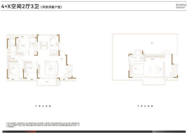 叠墅总高四层,设计了邻里空间,单元门设计也是非常的大气。上叠125㎡三房两厅三卫,顶楼闷顶层等可以拓展空间;下叠140㎡四房两厅三卫,另有超宽裕的赠送面积。
