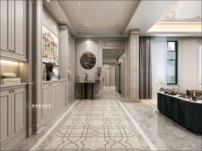 为保证业主舒适的居住体验,设计师选择弱化视觉冲击,以低纯度的色彩营造低调、高雅的氛围。通过层次分明的框线、水晶吊灯及顶部雕花,相互映衬,烘托和谐并富有张力的空间感,凸显业主对精致生活的极致追求。