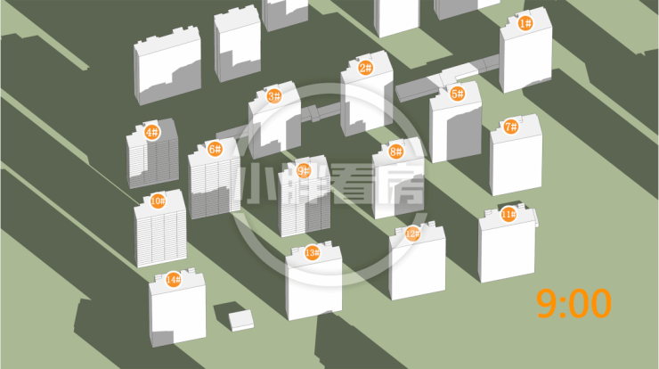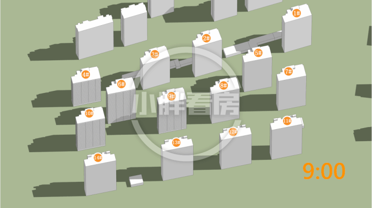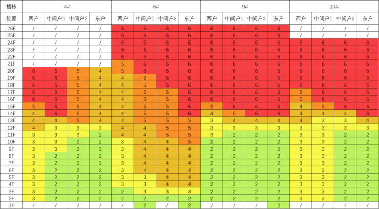 10#采光优异几乎不存在遮挡。4#6#中低层受遮挡。9#低层受遮挡。就具体遮挡时间而言,4#主要在上午受6#遮挡。6#主要在上午和下午受9#10#遮挡。9#主要在上午受12#遮挡。