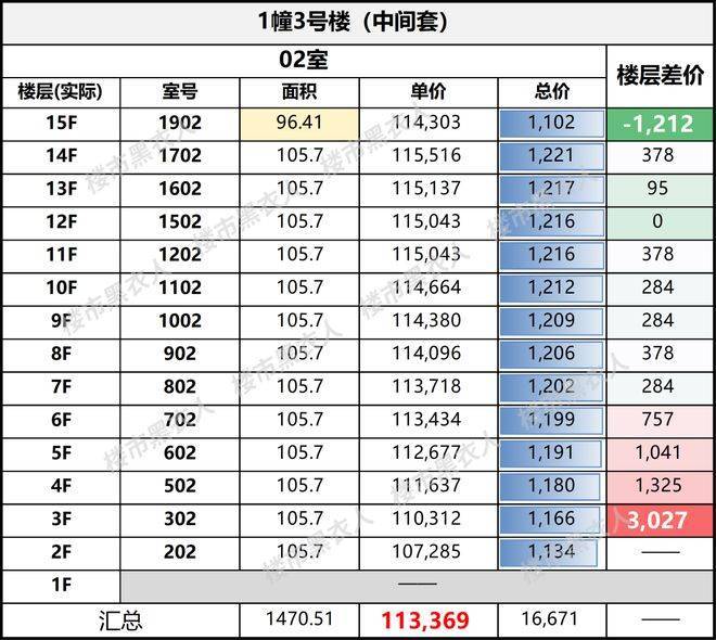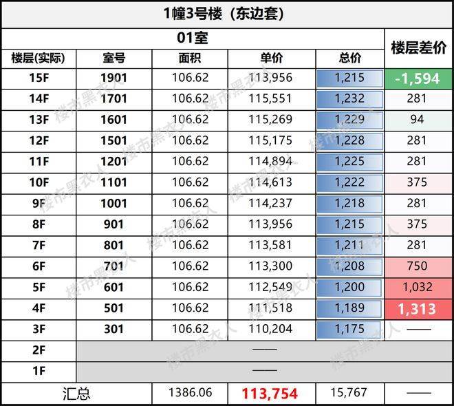 1号楼01室中间套<02室边套,总价仅900万出头;而最右侧3号楼的同类房源,套均总价要高出近200万。