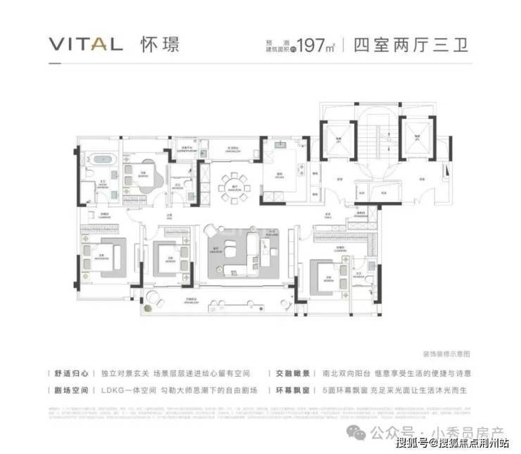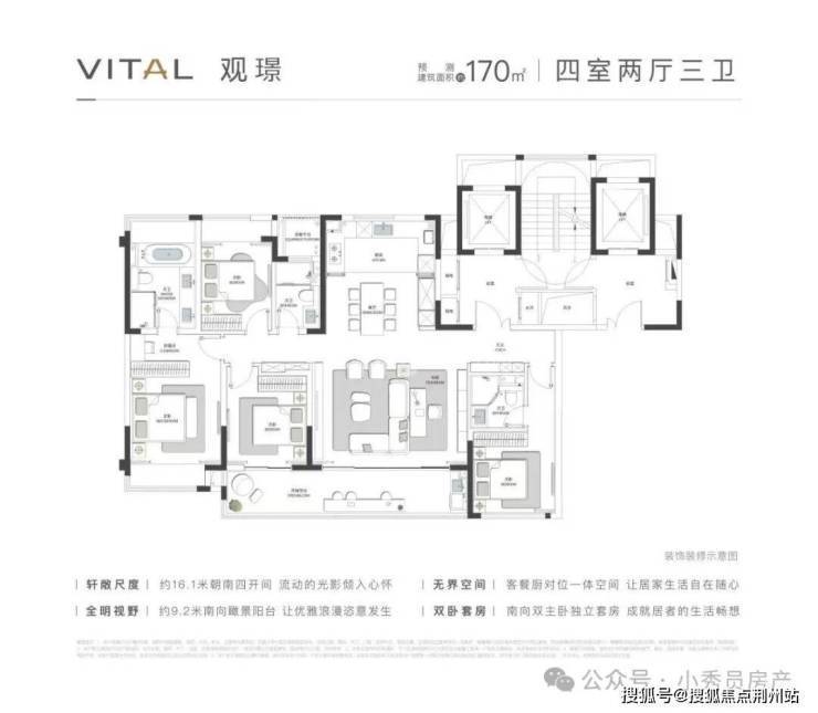 项目效果图更狠的是户型设计建面约170㎡起步 最大230㎡全系四房三卫 双套房起步主卧开间做到6.2米比普通楼盘客厅还宽敞这个叫拾月璟庭的盘活生生把科技城拽进"大平层时代"