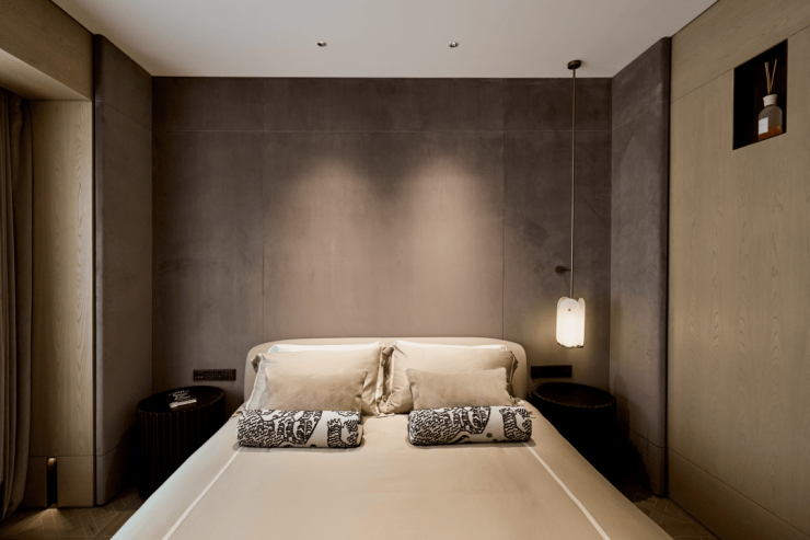 主卧背景墙则采用深灰色面料,配以木饰面,呈现低调奢华的高级感。