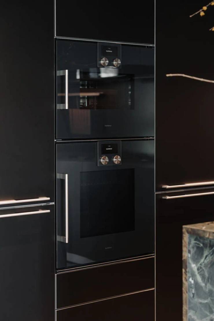 西厨岛台选用亚马逊绿岩板打造,搭配金属质感推拉门,高审美艺术性表现力满分!