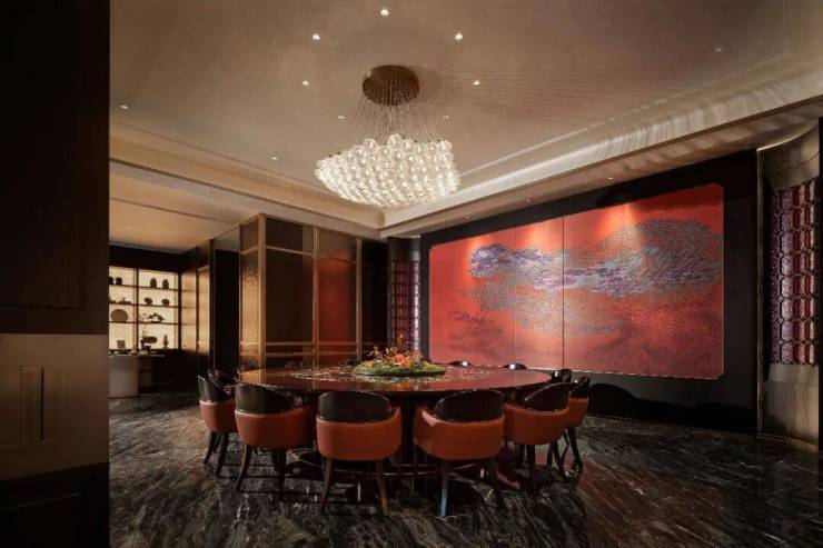 餐厅以"藕荷"为空间主旋律,取色于江南十二色。与墙面璀璨的苏绣相映成趣,营造出东方特有的克制奢华之美。天花板上悬挂着以人工吹制而成的“荷”造型琉璃吊灯,在灯光的映衬下若隐若现,宛如月色轻透夏日风荷,意境悠远。