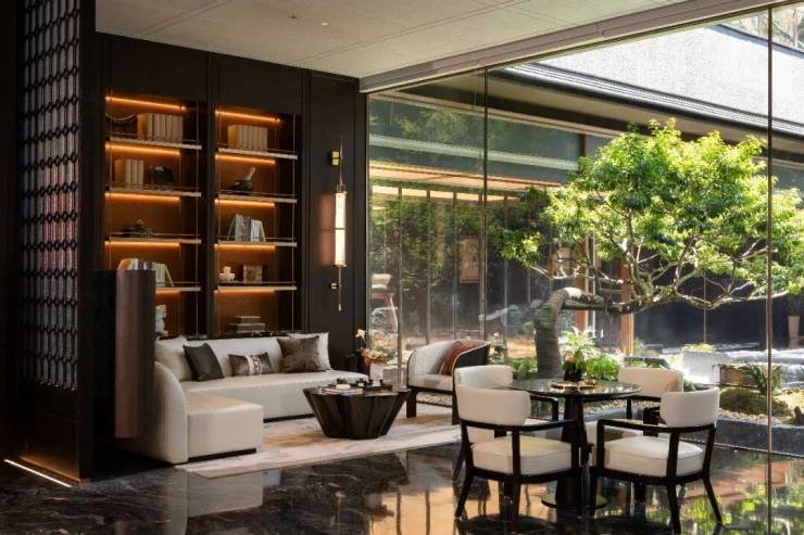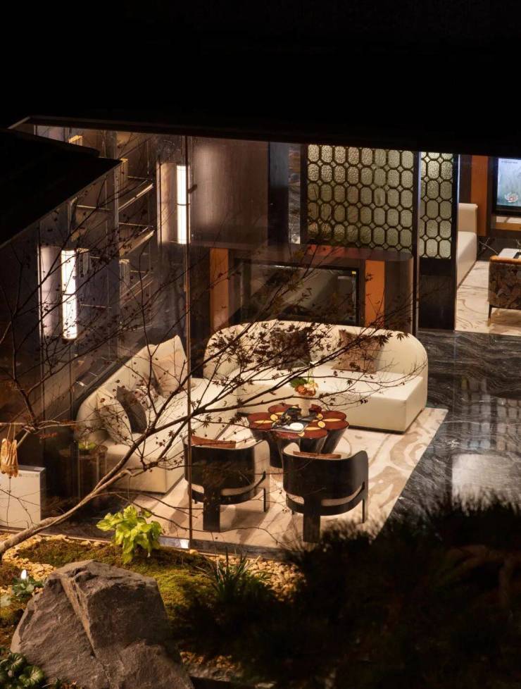室内四季流转,窗外景致一览无遗,窗内诗意画作与之呼应。胜景与意境相融,留白与节奏把控严谨,不着痕迹地营造出难以复刻的宁静与隐奢。
