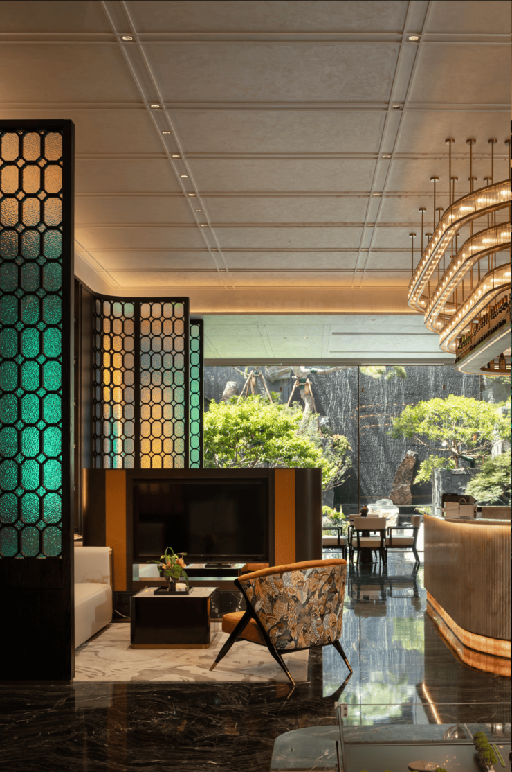 步入首层大厅,天花以流动的线条勾勒出水波荡漾的意象。通透的官绿色屏风采用水纹艺术工艺,通过「透景」手法,令此空间在屏风处形成「画中游」的视觉蒙太奇,形成视觉上的遮与引。