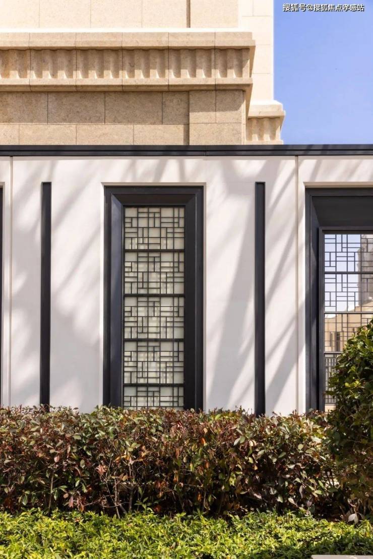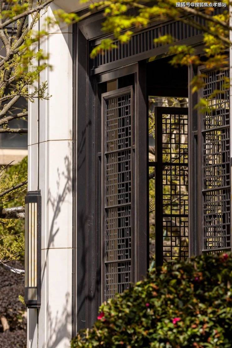 再来看公区,庭院的格栅,同样做了造型化处理,镂空形状不一,随着日光位置的变化,阳光洒落,造型十分灵动。