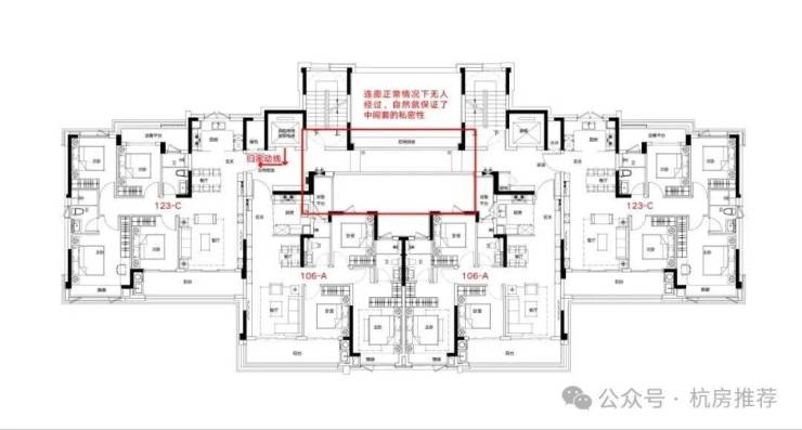 Due to the separate arrangement of the elevators and the setting of the corridor in the middle, the side suite does not need to pass through the corridor when going home (see the picture below).