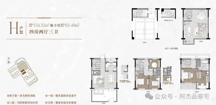 一楼和地下室主社交和志趣,二楼是子女的房间,三楼是主人休憩区。