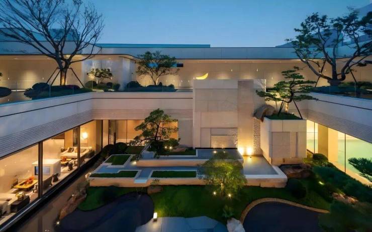 会所庭院以建筑为框,引泉植松,奢造约7米高溪山流瀑,特选6棵造型黑松。将二维的《溪山行旅图》转译为一幅“幽深与静谧、壮丽与宁静”的立体山水画卷。