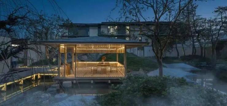 最点睛的创新笔触落在了空中滨水会客厅,门头两侧高达12米的沙朴树,婆娑树影投射在水面。