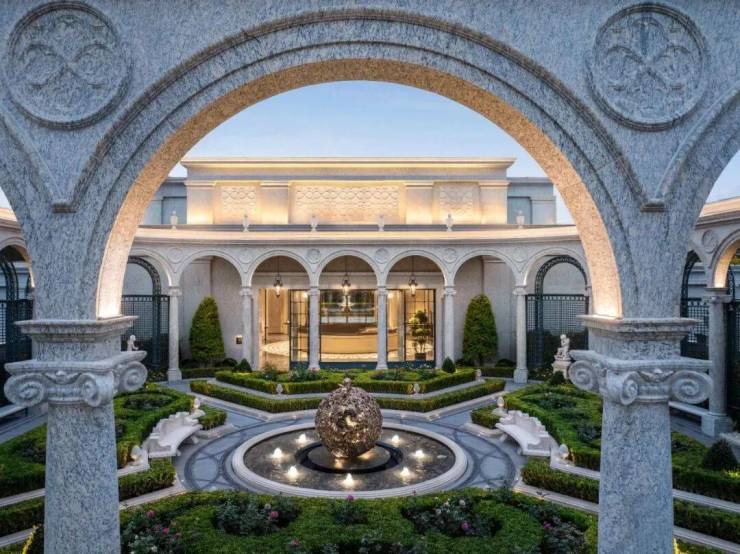 弧线优雅的法式圆拱廊架、灵动的涌泉、优雅的八角亭台、凡尔赛宫般的魔纹花坛、石材雕花座椅、水珐圆池层层跌水……