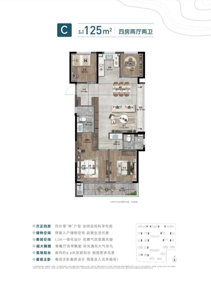 中建·潮阅尚境,建面约125方四叶草边套,四室两厅两卫的格局,让改善生活大有可享。入口的玄关,幻化归家的礼序,让生活竟然有序;近31方的LDK一体化大通厅,装载生活的万千想象,每次派对组局,尽显主人排场;星级主卧套房与南向次卧自带大飘窗,接连约6.6米双联阳台,日常起居,阳光倾泻而入,谱写心动的日常。