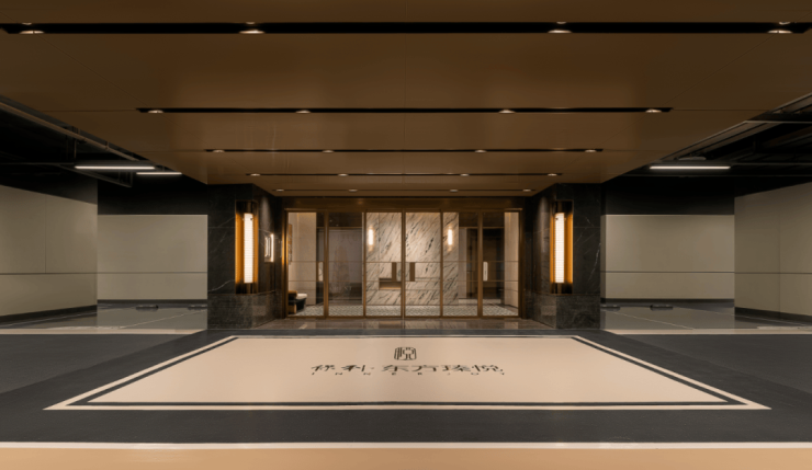 视觉的焦点是一场精心编排的东方叙事:中央镜面水景中,涌泉不息,其潺潺声息宛如一首欢迎曲;水中静立的一株日本冬青,以生命的绿意与稳定的形态,与水景构成一幅“动静相宜”的写意画。