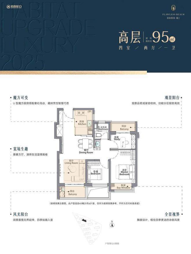 再加上南向大面宽短进深、全卧飘窗、L型转角阳台设计,哪怕小户型95㎡3房,尺度感都超棒,采光和视野更是一流。