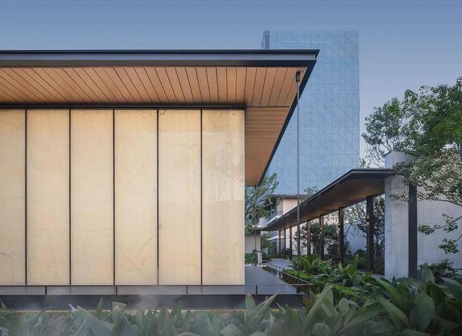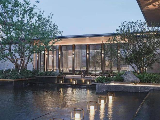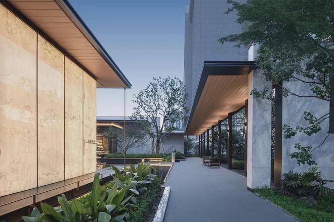建筑门堂的比例恰到好处,呈现出诗意画境。1:5至1:6的高宽比,使建筑既稳重又灵动。入口两侧的景墙与水景相映成趣,勾勒出一条充满诗意的归家之路,体现了江南昆山的东方韵味。