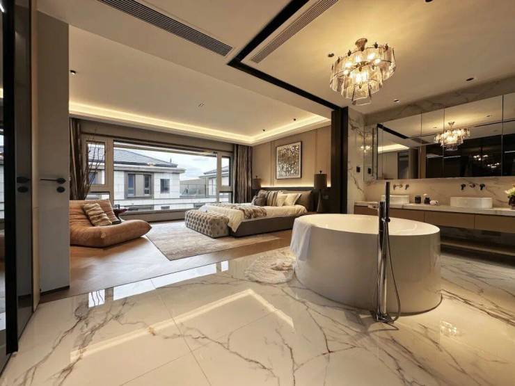 值得一提,得益于毛坯交付的灵活性,三楼主卧除必要的卫生间区域预留外,完全可根据主人偏爱自由设计。那些在高层里难以实现的步入式衣帽间、独立梳妆区、嵌入式书房等需求,在这里都能一一融入,尽显墅居生活的豪横与惬意。