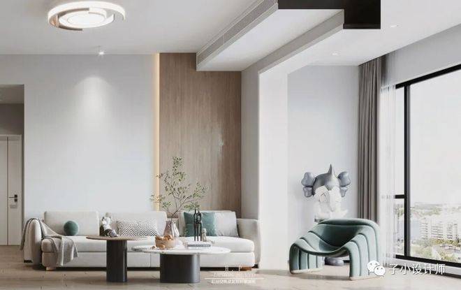 餐厅与客厅位置使用木饰面板材穿插出现,提升氛围感的同时,达到对房屋出现的洞口与过梁进行弱化效果,视觉上更具设计感。