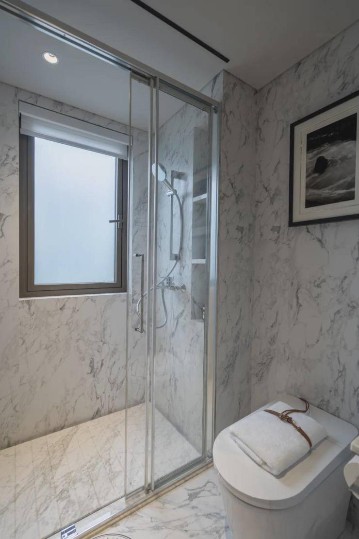 就连淋浴房也是细节满满。无边框淋浴门、门把手处采用了非遗工艺“编织细纹”,高奢酒店才有的隐藏式地漏设计,顶喷花洒的水管隐藏式设计,壁龛内还做了导水槽防止积水。