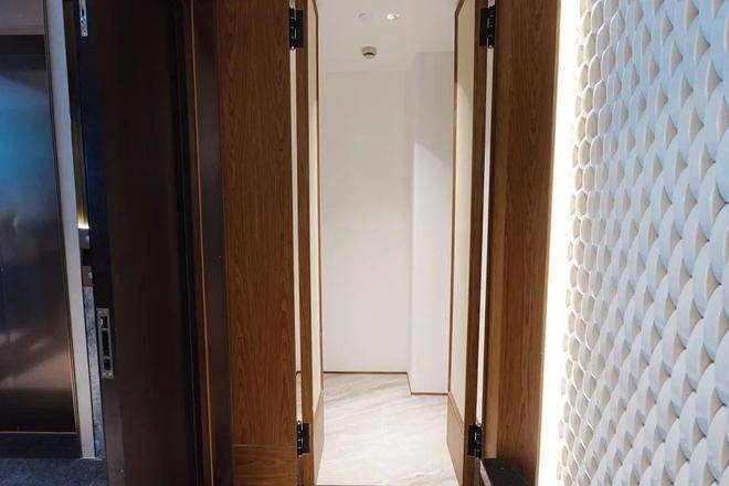 安高这次打造的交付样板间,是从电梯厅开始的。107㎡是一梯两户,电梯间区域,主要以不锈钢条作为通高区域的墙面划分,吊顶带金属弧线。