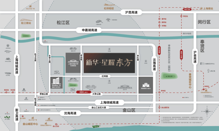 双轨加持——距离金山铁路亭林站约2.5km,5站到上海南站,轨交南枫线(规划)串联上海南部客流主动脉