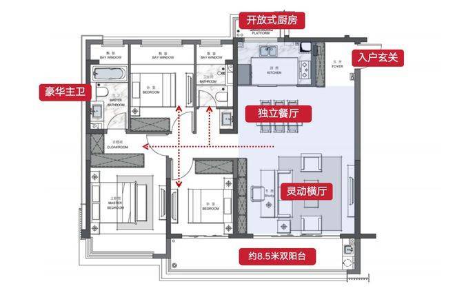 公区LDKB一体化设计,外接跑道式阳台,生活场景更丰富;