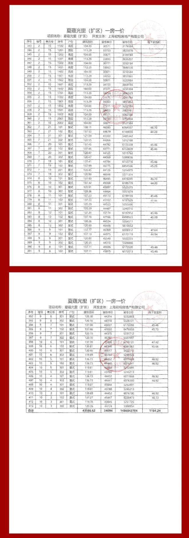 项目一房一价表