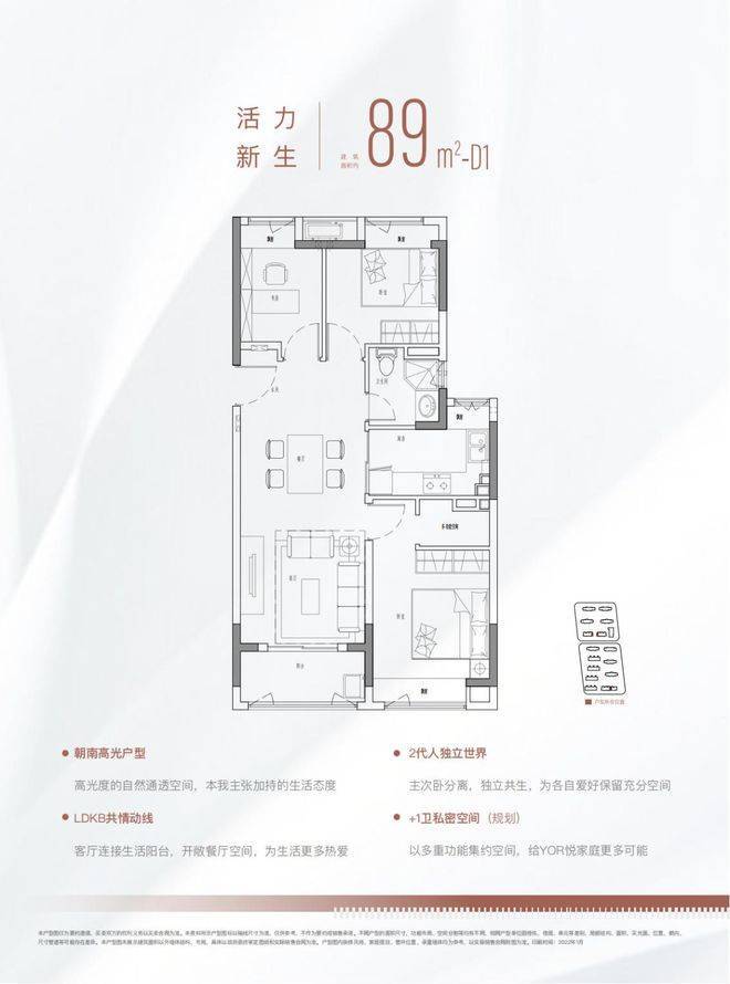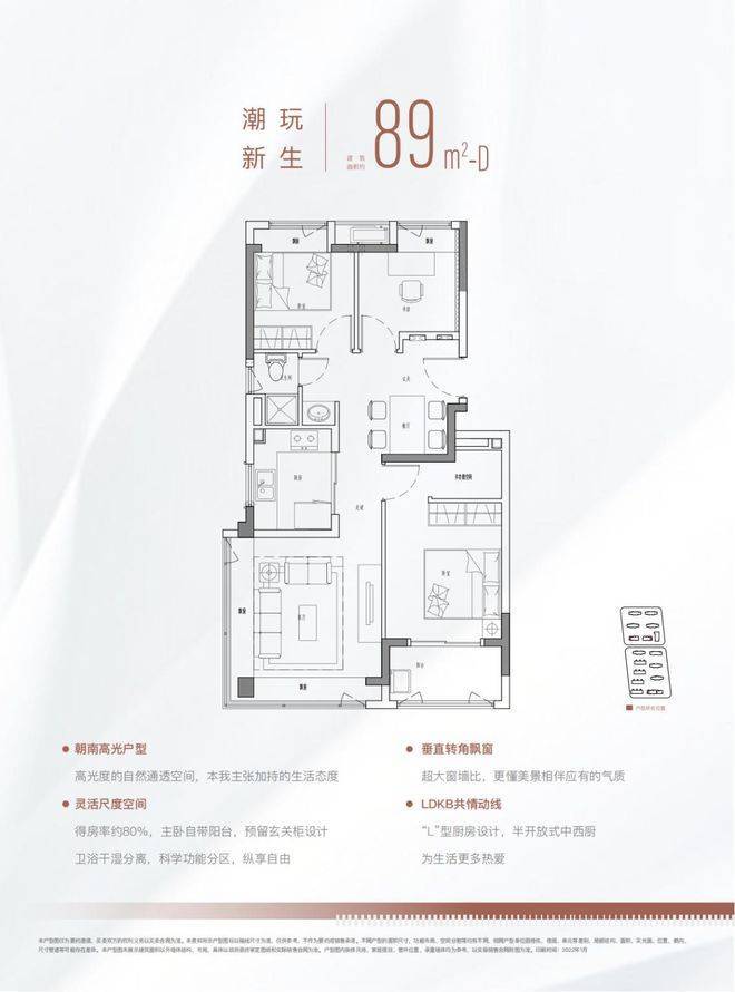 89㎡3房2厅2卫(规划)功能户型,入户洗手台规划设计,为业主在疫情常态化的新生活提供更健康的居家生活方式。