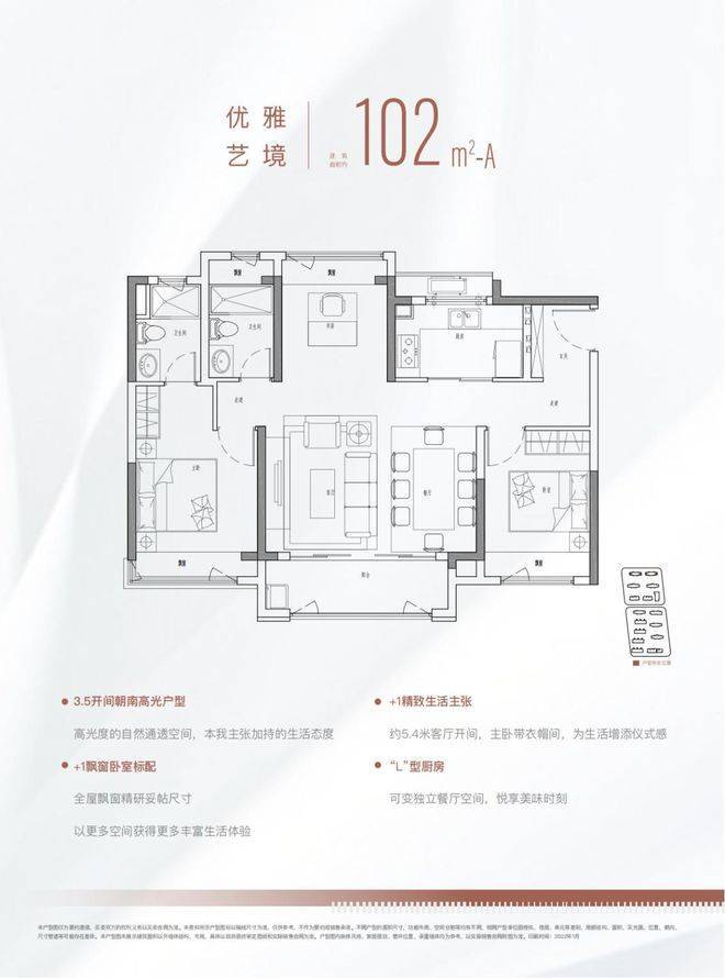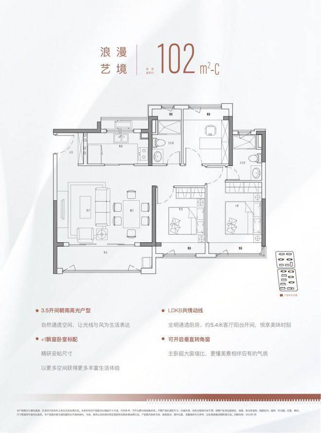 102㎡三房两厅两卫的舒适户型,约5.4m横厅设计,3.5开间朝南,得房率约80%左右(*该得房率仅供参考,最终以开发商官方数据为准);每间房均有飘窗,全屋飘窗共享有额外的面积约13㎡(*此处面积仅供参考,最终以开发商官方数据为准)在市场上也是少有的产品。