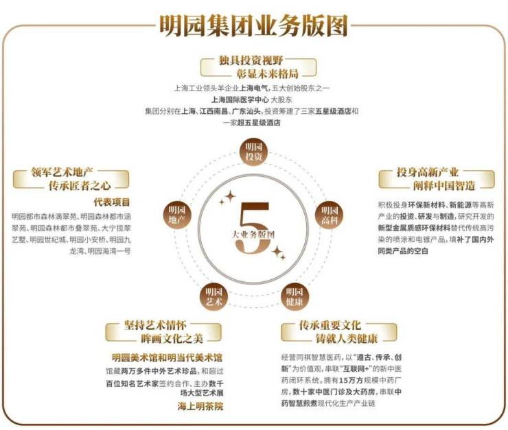 明园地产、明园投资、明园艺术、明园健康、明园高科五大业务版图
