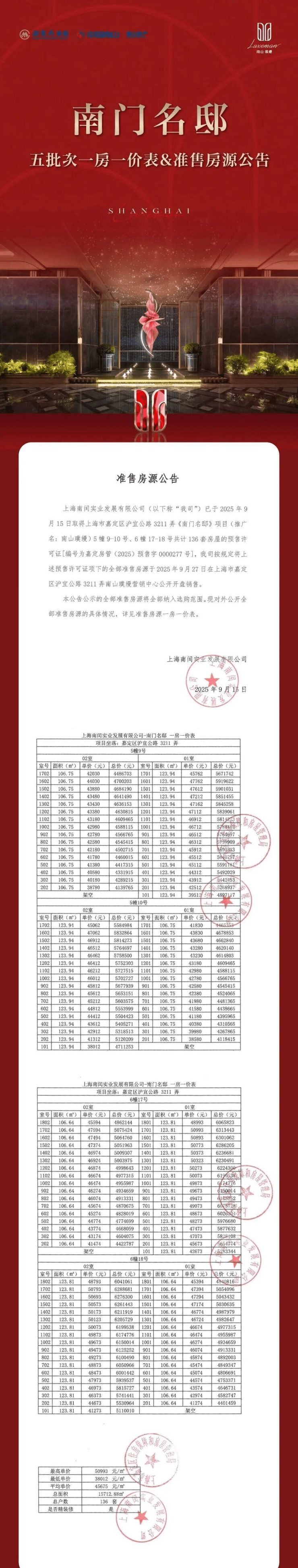 最新消息:南山璞缦项目五期加推105-123㎡3房户型,共136套房源,过会均价均价45675元/㎡;另前期少量105-198㎡3-4房在售,总价365万起,可直接认购!作为嘉定新城封面豪宅产品,项目备受购房者的关注!