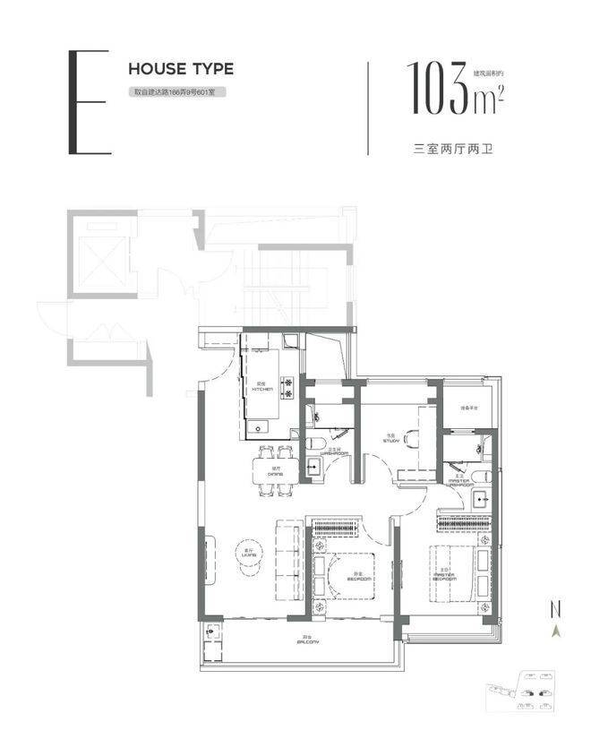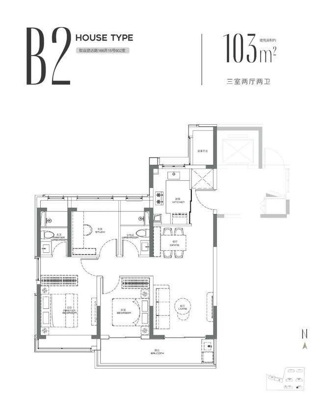 约100-103㎡ 宽适成长款:精准适配成长型家庭,经典的三房两厅两卫格局,南北通透。特别是采用了客厅与次卧阳台打通的设计,极大地拓展了生活实用空间的通透感。