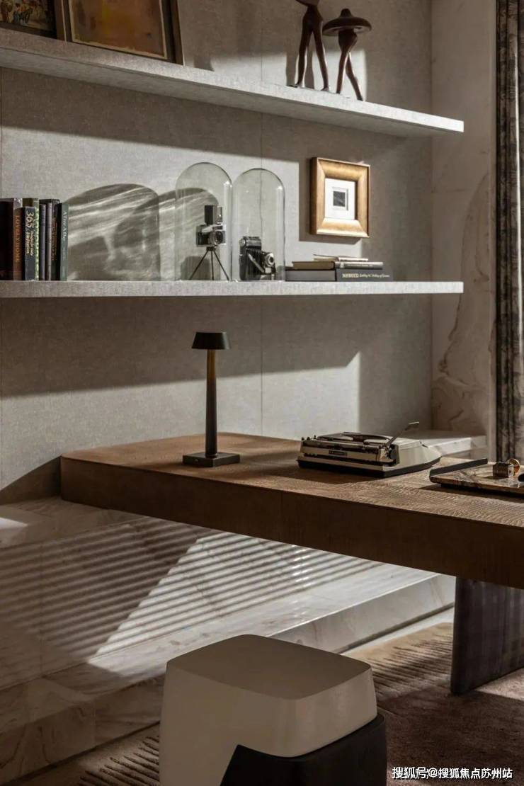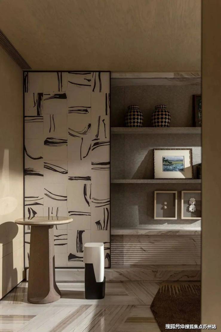 私密场域依旧保持静谧,黑白色基础上搭配了更多的色彩,例如深棕、浅紫等,艺术品的衬托深邃迷人,热络了家的氛围。
