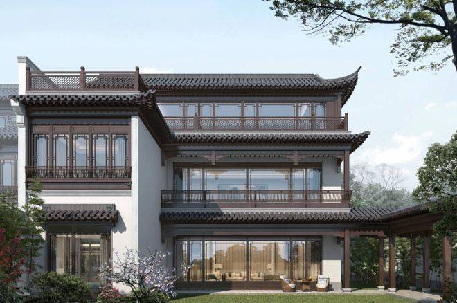 叠墅外立面则采用铝型材、仿木纹色格栅、仿木纹铝板、保温一体板搭配玻璃栏板、灰蓝色low-e玻璃,打造南北双立面。合院外立面的打造上,项目巧妙地将中式建筑的精髓与现代元素相融合,运用现代材料及手法,将传统的窗、门、瓦等元素转译得栩栩如生,既保留了传统美学的韵味,又展现了现代建筑的创新与活力。坡屋顶、飞檐戗角、回廊挂落、雕花窗等细节之处,更彰显出中式大宅的贵气与身份象征。承袭中国文人造园理想,以“吴门四家”仇英大青绿山水《桃源图卷》为灵感,运用一环,五庭,三坊,七巷规制,形打造了一条由宅、巷、园、庭、门构成的五重归家路径。汲取苏州名园的造园精髓,复刻月到风来亭、濯缨水阁、小飞虹等,以画入江南,遵循构景七法:借、添、框、漏、对、藏、障打造天人合一的盎然志趣。