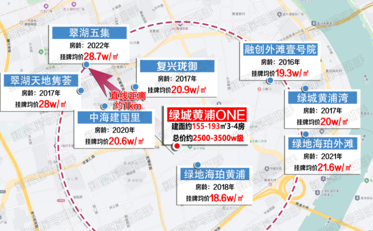 「绿城·黄浦ONE」坐落于公认的豪宅板块,可谓“身处贵胄之地,尽享圈层之利”,周边直线距离约1km范围的次新豪宅挂牌价基本都在约18w-29w/㎡,堪称名副其实的房价天花板地段!