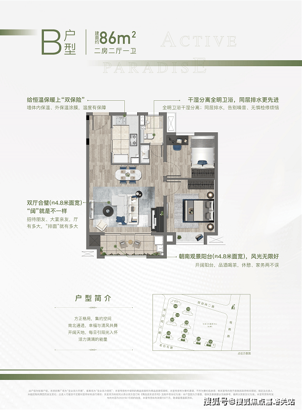 客厅与餐厅连为一体,约4.8米大面宽设计,外连观景阳台,拥揽四季的人生景致。