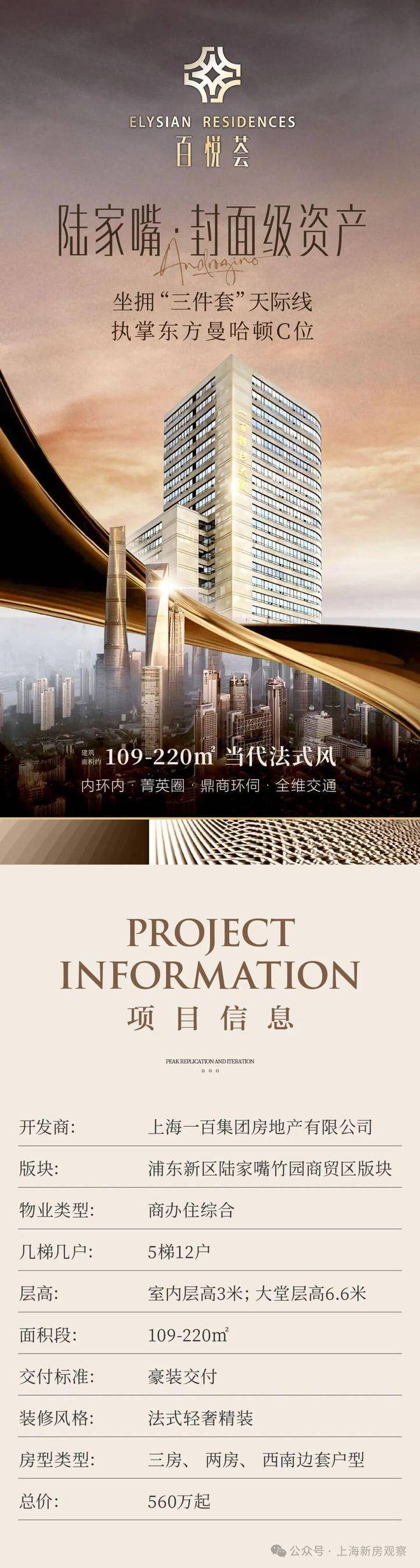 陆家嘴坐拥三件套天际线!【百悅荟】建面约109-220㎡2-3房,总价560万起!