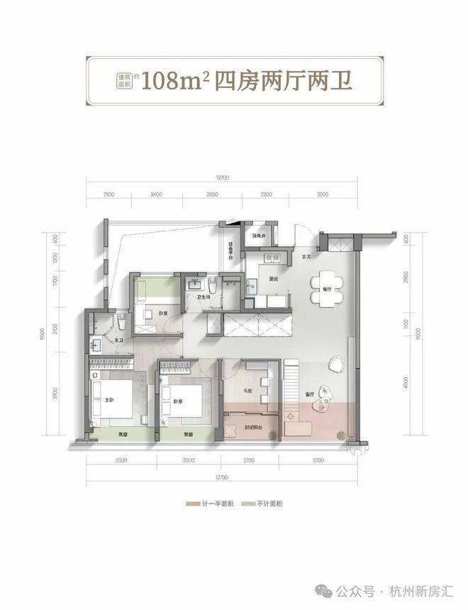 南向主卧带走入衣帽间,南向次卧带270°采光与观景视野阳台,甚至北向两个房间开间均达约3米,通常这些是很多在售140㎡以上户型才有的房间尺度感。这款128㎡户型。