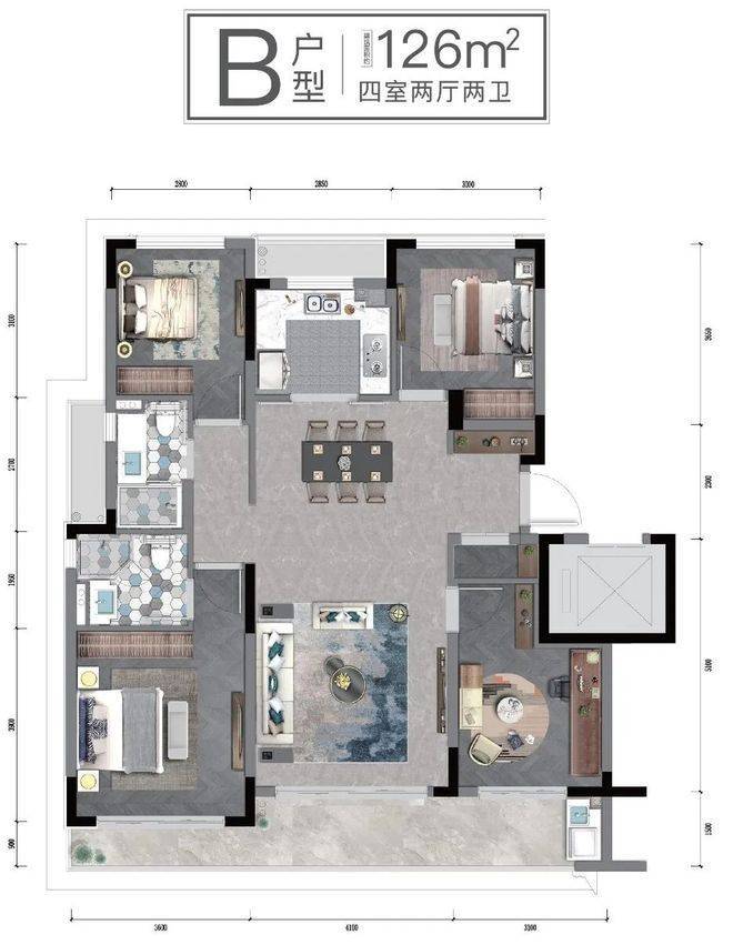 建面约126㎡户型,做到四房两厅两卫,在建面约112㎡的亮点上,升级至“四叶草”户型,同样十分惊艳。