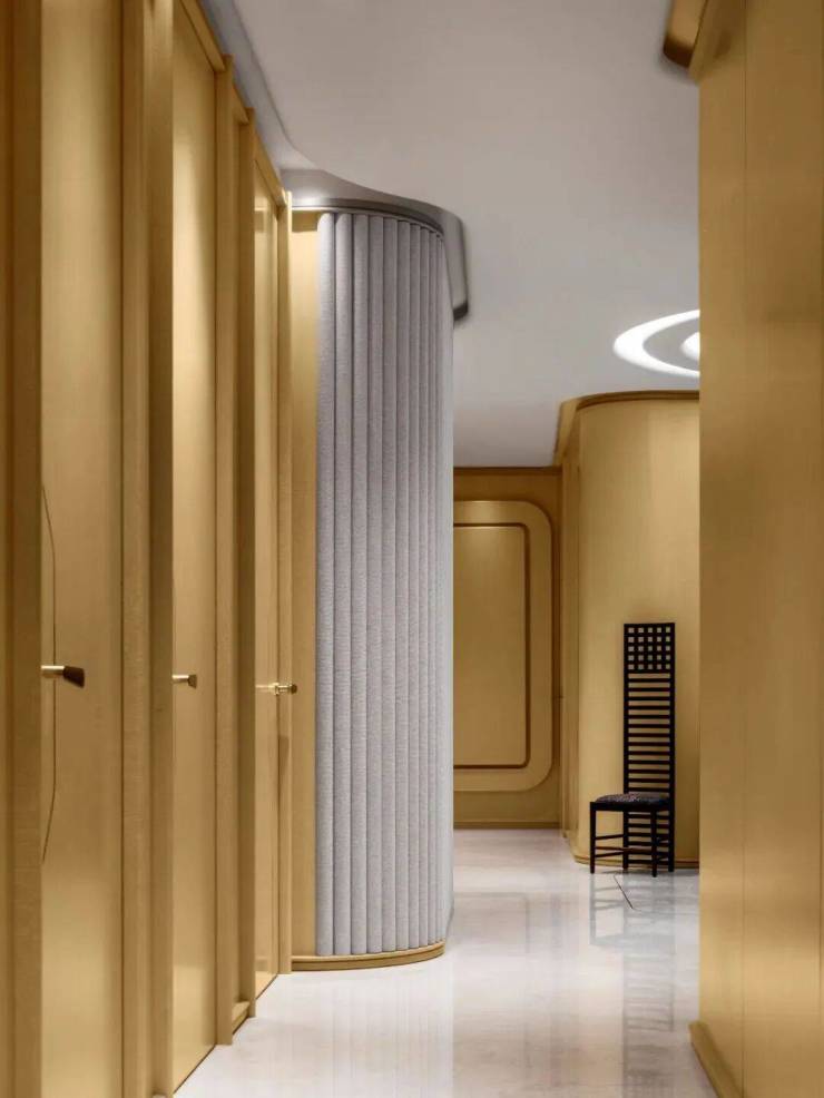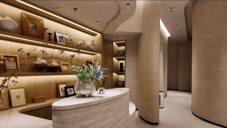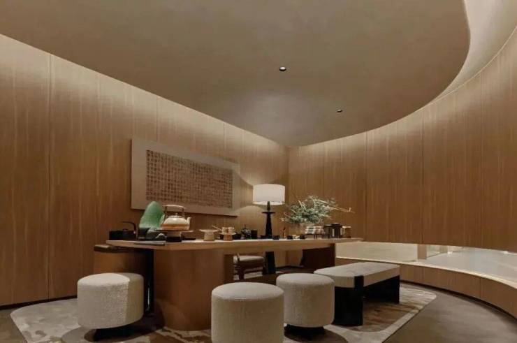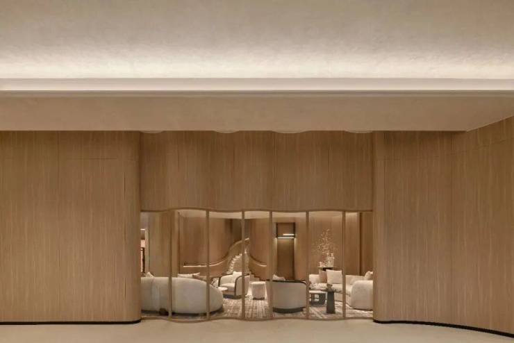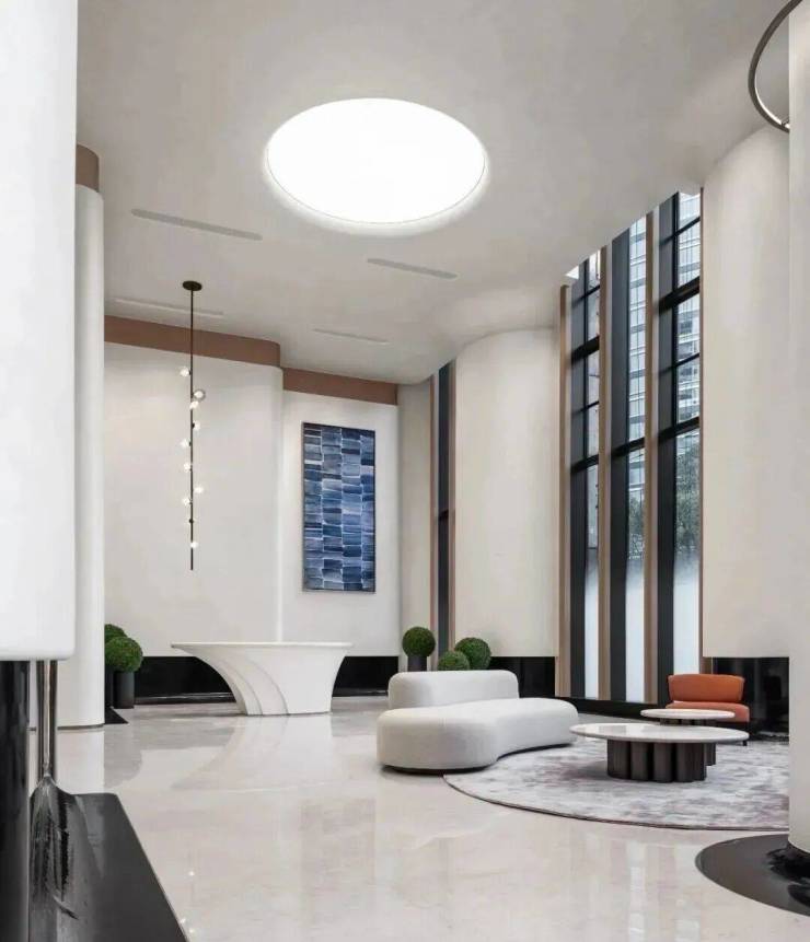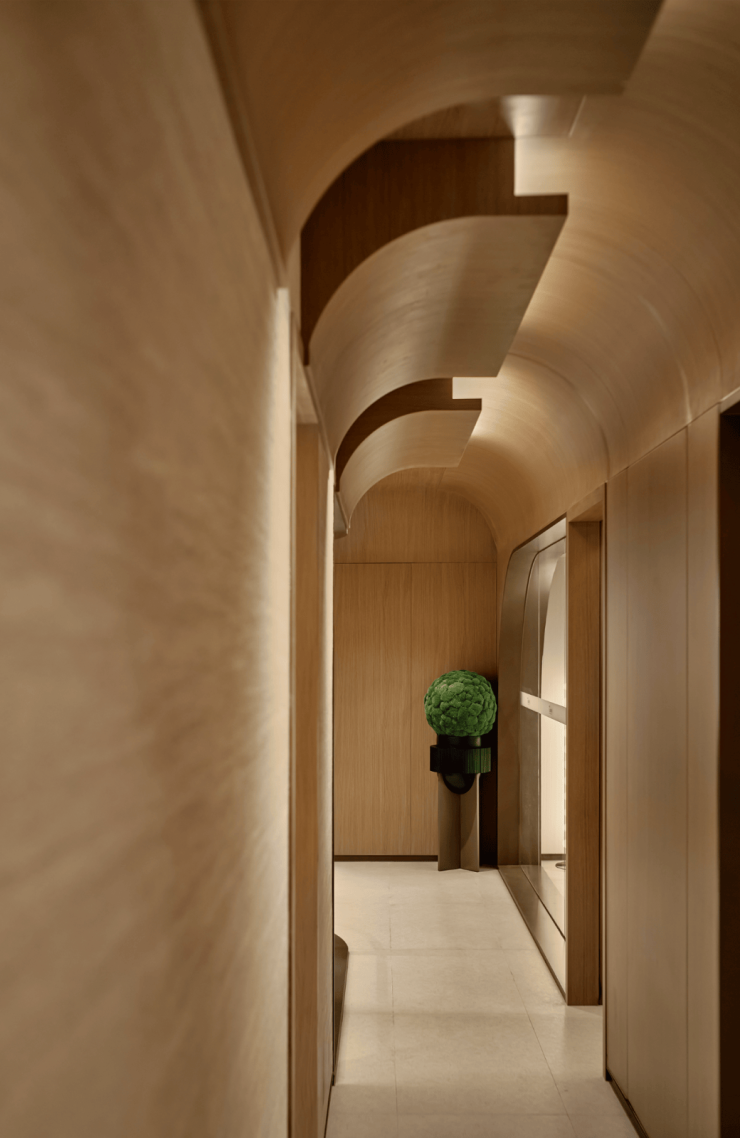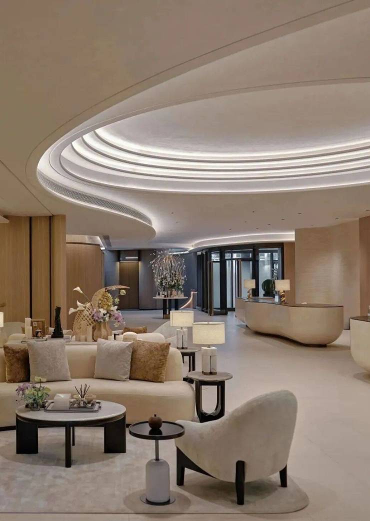 会所作为项目的核心配套,总面积超4000㎡,以“水之韵律”为设计灵感,所有边界均被柔化,没有一条生硬的直线,呈现出流动的呼吸感。迎宾区采用浅色木饰面搭配绿色植物背景,营造出宁静雅致的归家氛围;中庭设置圆形天井,层叠线条如水波,自然光倾泻而下,搭配艺术大师陈逸飞的雕塑作品《东方少女》,形成兼具艺术感与人文气息的核心空间。