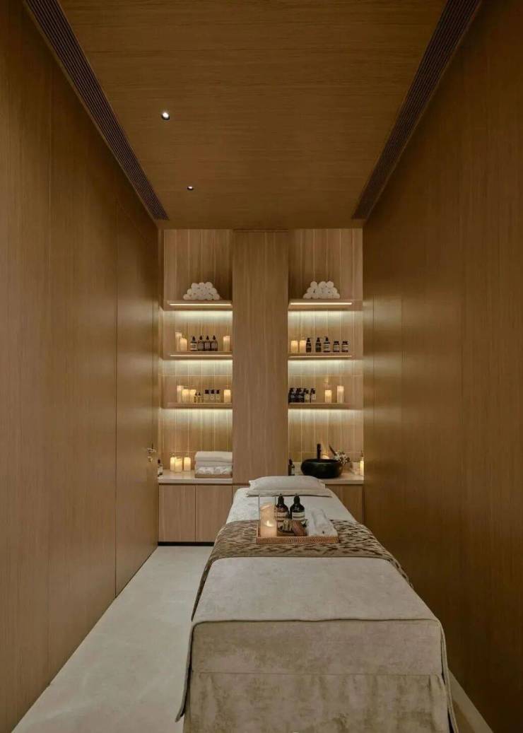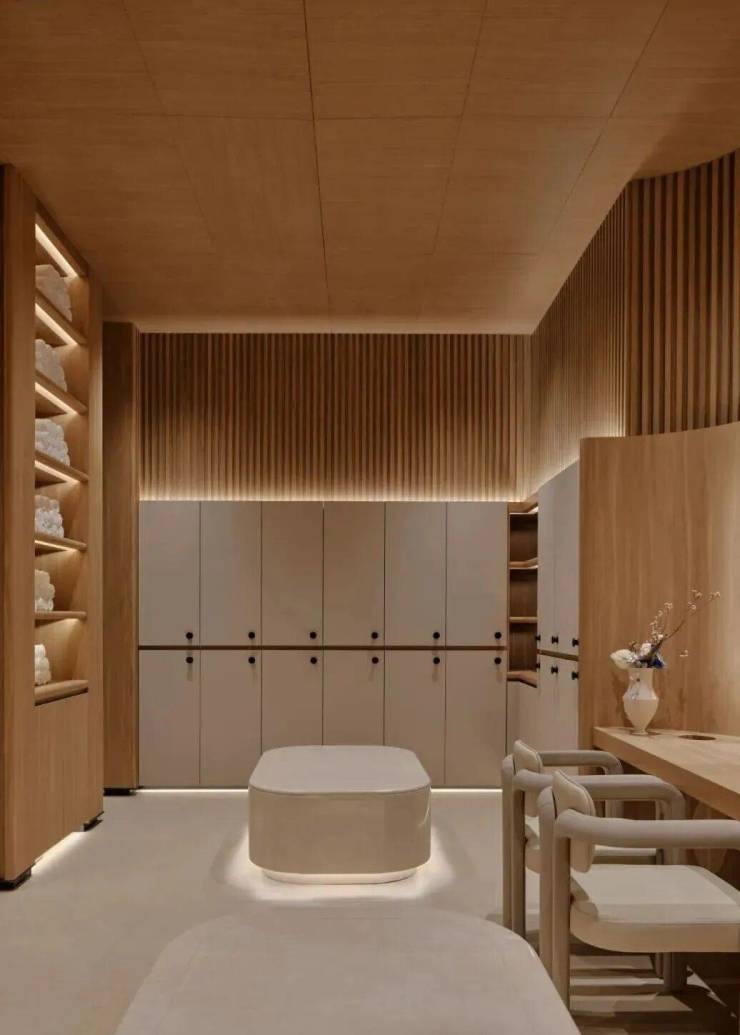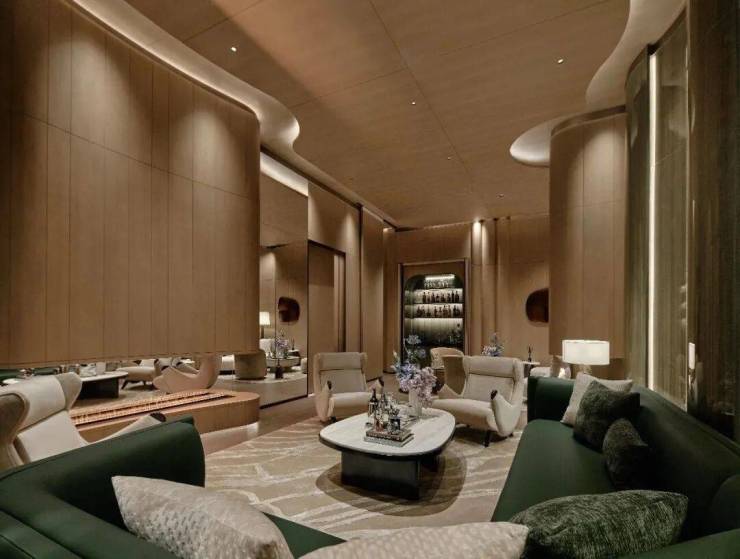 会所功能分区完善,中庭两侧分布着茶室、红酒雪茄吧与宴会厅,宴会厅可实现中式圆桌私宴与西式长案私宴的灵活切换,红酒雪茄吧采用环抱式座椅与弧形沙发,营造出静谧私密的社交氛围。下层空间则配备健身区、瑜伽舞蹈室、SPA疗愈区与恒温泳池,其中恒温泳池采用10米垂直挑高吊顶,搭配不规则天窗,可引入自然天光或模拟不同时段的光影,与北侧瀑布形成虚实呼应,打造出滨水秘境般的体验。
