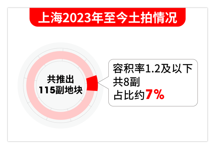 据小编统计,上海2023年至今,上海土地市场合计推出115副宅地,仅有8副容积率1.2及以下地块,占比约7%。