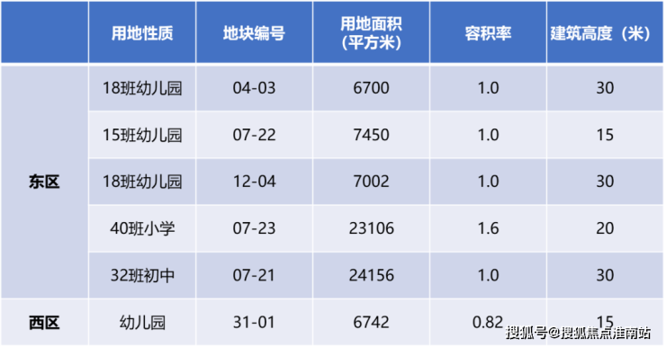 东区和西区最大的不同在于教育和公建设施配套,东区人口更密集,有5幅教育用地,从幼儿园至初中;而西区仅有1幅教育用地,作为幼儿园。