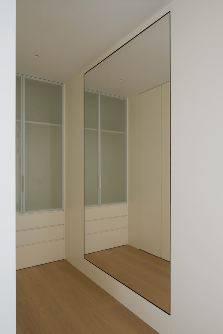 作为入户第一幕,玄关以极简姿态开启生活叙事,素净墙面如天然画布。清透支架托举着素白花瓶,植物姿态俏皮延展,成为连接户外与生活的温柔过渡。