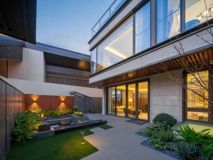 项目充分利用场地宽度,联排产品均为大面宽短进深设计,约7.9米以上南向开间,首层约3.4米层高,客厅纵向挑高约6.4米,提高人居舒适度,是大气场、强身份的象征;地下挑高空间、天地双花园、多星空露台等附赠空间,加倍提升空间利用率,实现了舒适改善与“最多8房布局”功能改善的兼顾,更让中国人向往的“有天有地”院墅生活,有了实现机会。