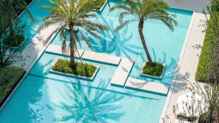 沿着迎宾树阵归家,步入东南亚风情度假园林,胡柚、晚樱、红枫...全冠移植诸多名贵树种,创造沉浸马尔代夫的度假体验。