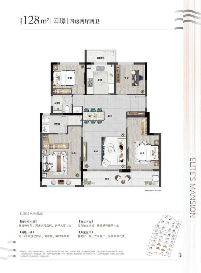 南区7#楼在售人气户型——约128方四叶草户型,则巧妙地将各个功能区域分隔开来,既保证了家人之间的私密性,又不失亲密感。