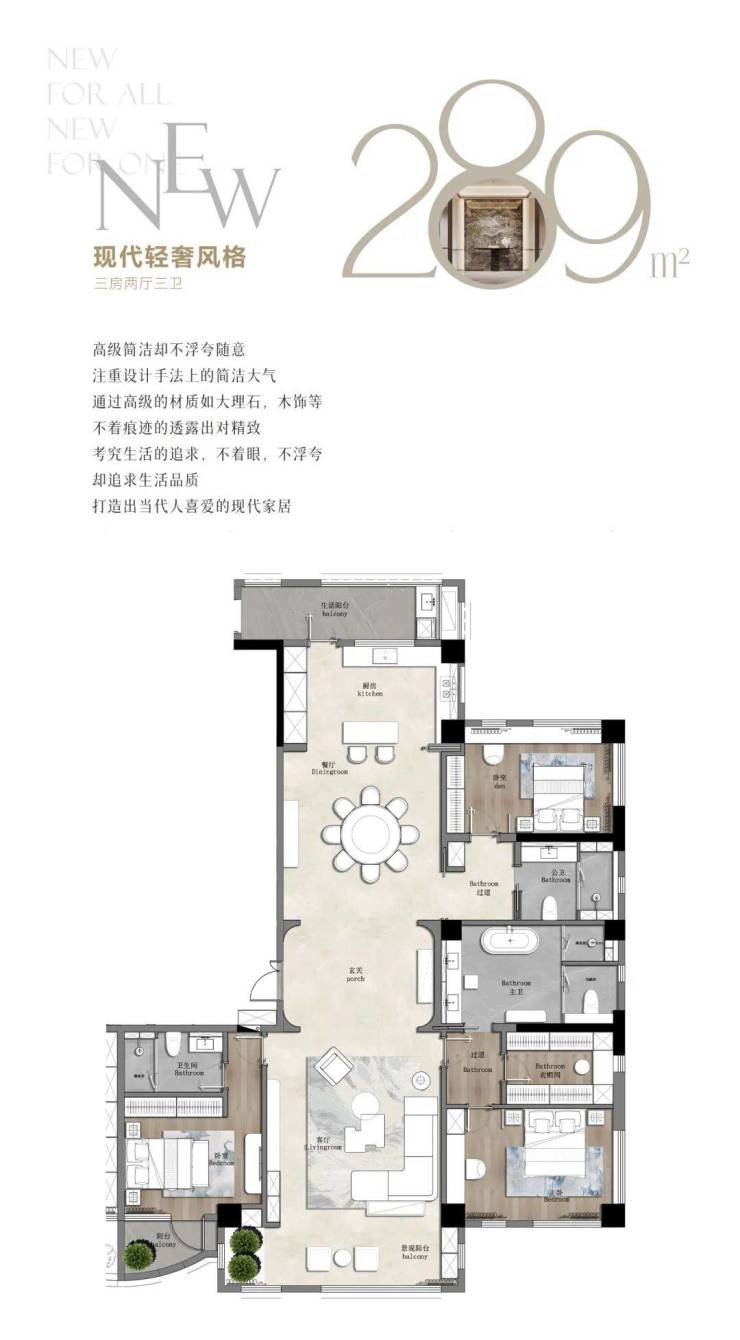 285㎡主力户型:南向五开间,全明三卫,可灵活拆分为子母套房;