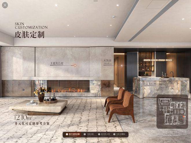比如皮肤定制,墙面、地面、全屋柜门均提供多材质、多配色可选,客厅背景墙、岛台亦有多种石材方案自由搭配;