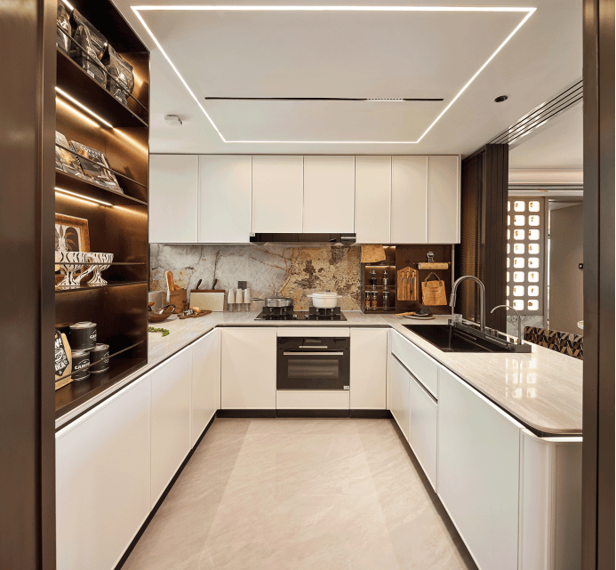 U 型厨房更创新采用上海首个高低台设计,既解决下厨弯腰痛点,三面台均分还能拓展操作空间。